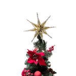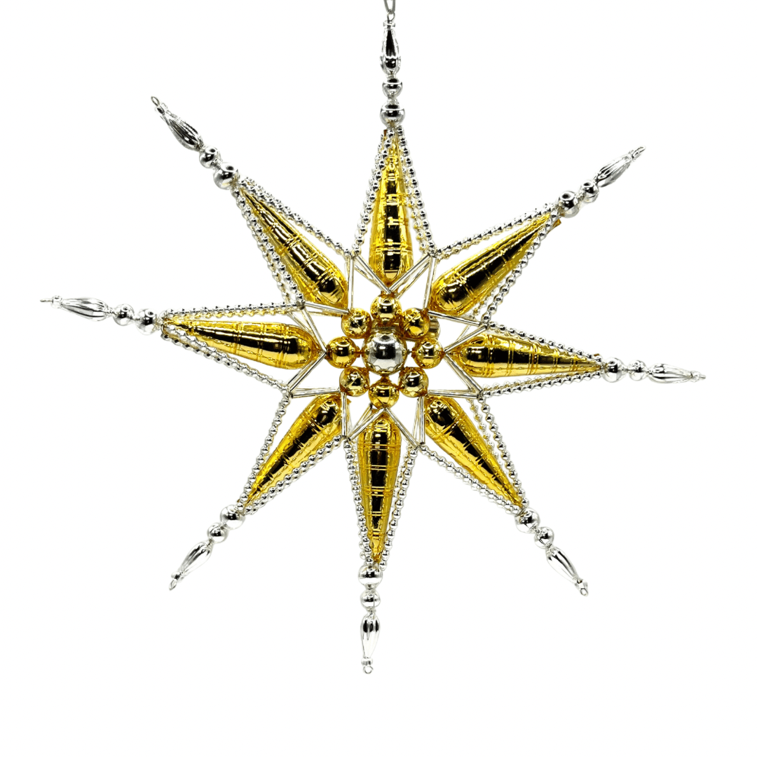 This gold star Christmas tree topper is made of glass hollow beads from the Czech Republic. The tree topper comes with a clip attachment. The Christmas tree topper is hand blown and hand painted with a centuries-old tradition.