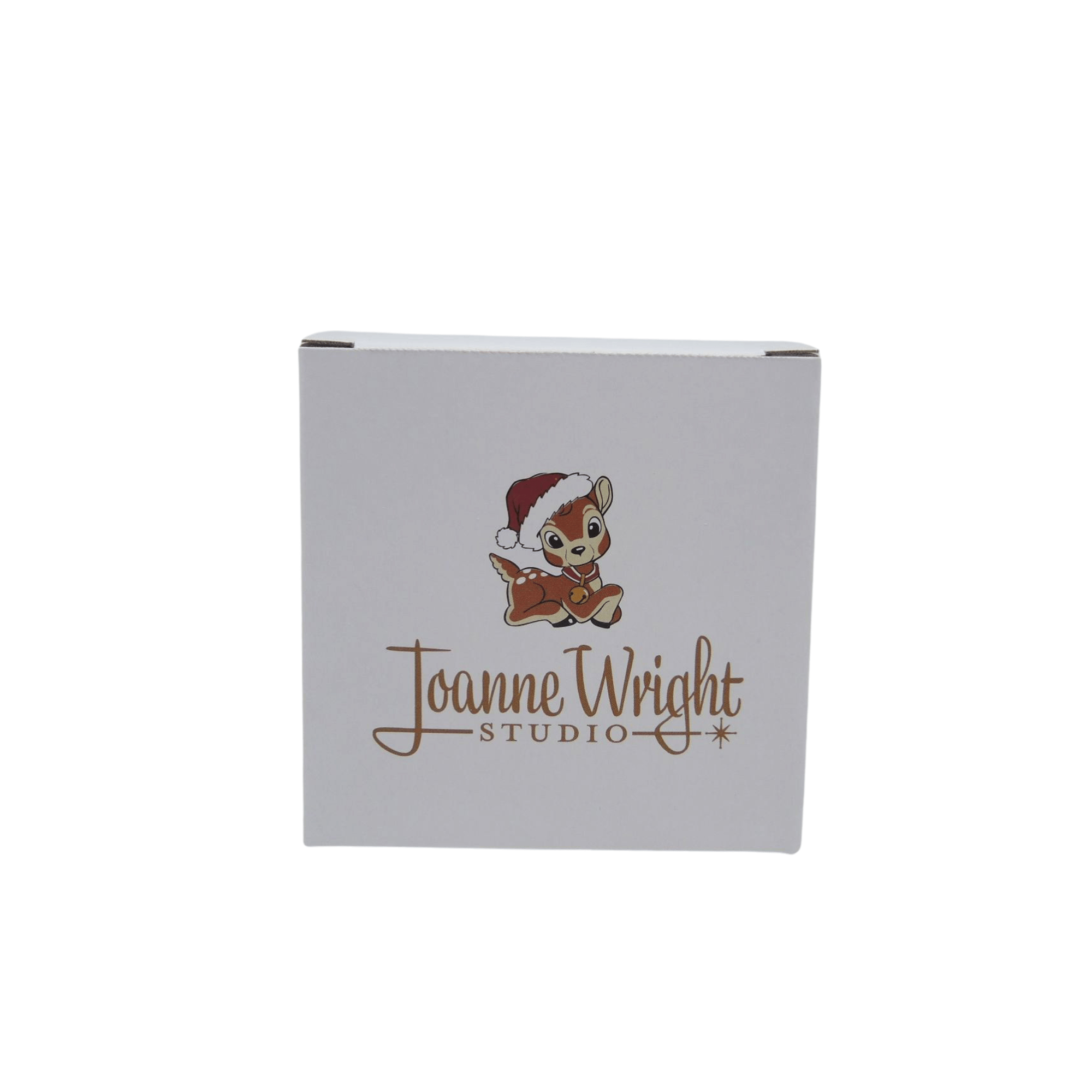 Inspired by the Joanne Wright Studio Retro Christmas Collection, this porcelain retro reindeer Christmas tree ornament is the perfect addition to a nostalgic Christmas holiday display. Each deer is wearing a festive red ribbon with a gold metal bell around its neck and a fabric Santa hat attachment on top of its head. Each ornament has a white gauze ribbon attached for hanging and will come in a white box that is perfect for gifting, storing or preserving your ornament. Additionally, each ornament will be hand-signed. This is a limited edition!