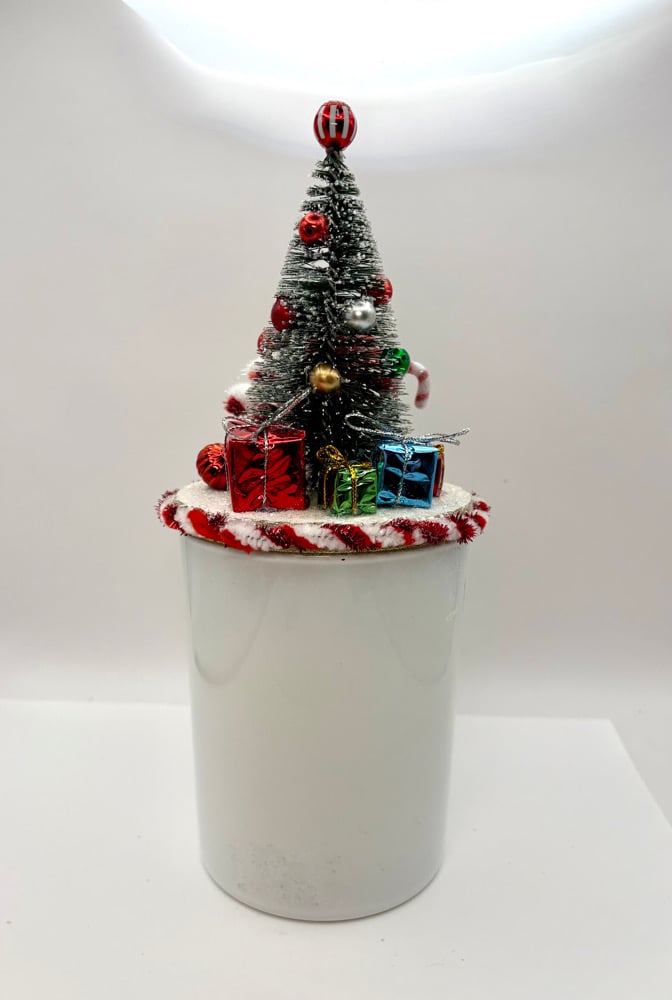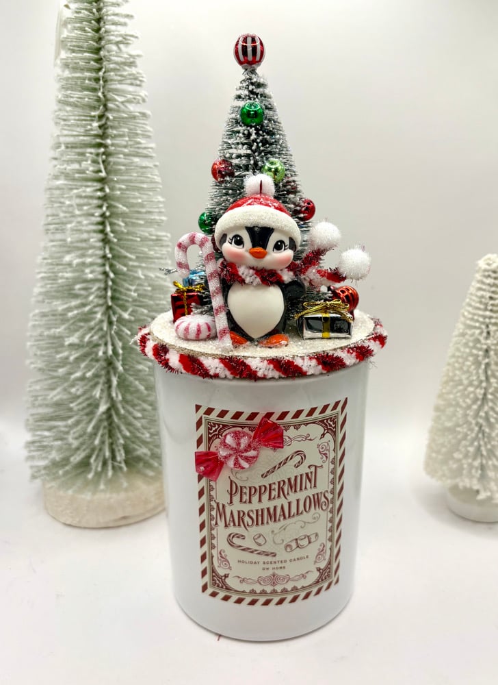 A perfect way to decorate your candles this holiday season, the Retro Penguin Candle Topper is hand made by Joanne Wright. The Candle Topper is sold with the Peppermint Marshmallow candle, which sure does smell delicious! The Retro Penguin is surrounded by candy, presents and a bottle brush tree. The candle topper does come off so the candle may be used.
