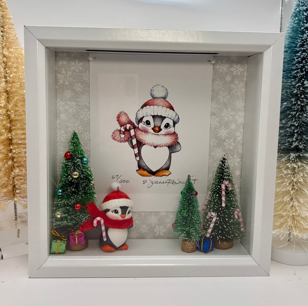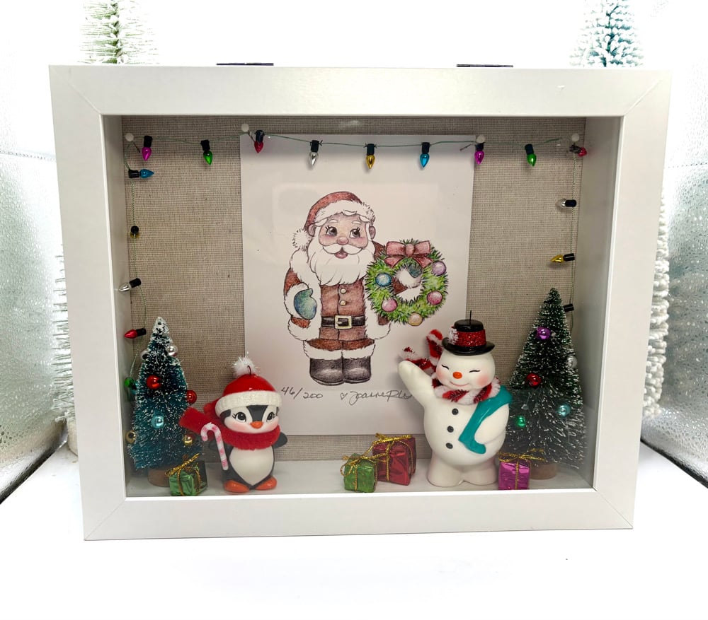Placed together in a shadow box ready to display, the Retro Penguin, Retro Snowman, Retro Deer and/or Retro Santa Christmas Tree Ornaments and sketches perfectly complement one another. For added storytelling, bottlebrush trees and holiday decor have been placed inside the shadow box as well on some variants. The print is a reproduction of the original sketch that inspired the Christmas Tree Ornament, size 5" x 7." Each sketch is numbered and signed by the artist. Each shadow box is 8"x 8" with a white wooden frame and glass front.