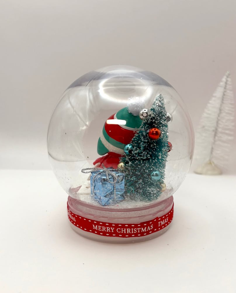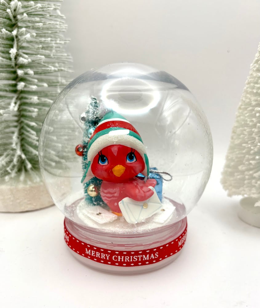 Standing in the middle of a snow globe waiting for the snow to fall, the Retro Red Cardinal is displayed around pieces of mail, a present and a bottle brush tree. Designed and hand assembled by Joanne Wright, the snow globe has a glass dome covering the wintery scene gives a 'snow globe' like look. The globe is wrapped around the bottom with a "Merry Christmas" ribbon. This Retro Red Cardinal Snow Globe is the perfect addition to your Christmas holiday display.