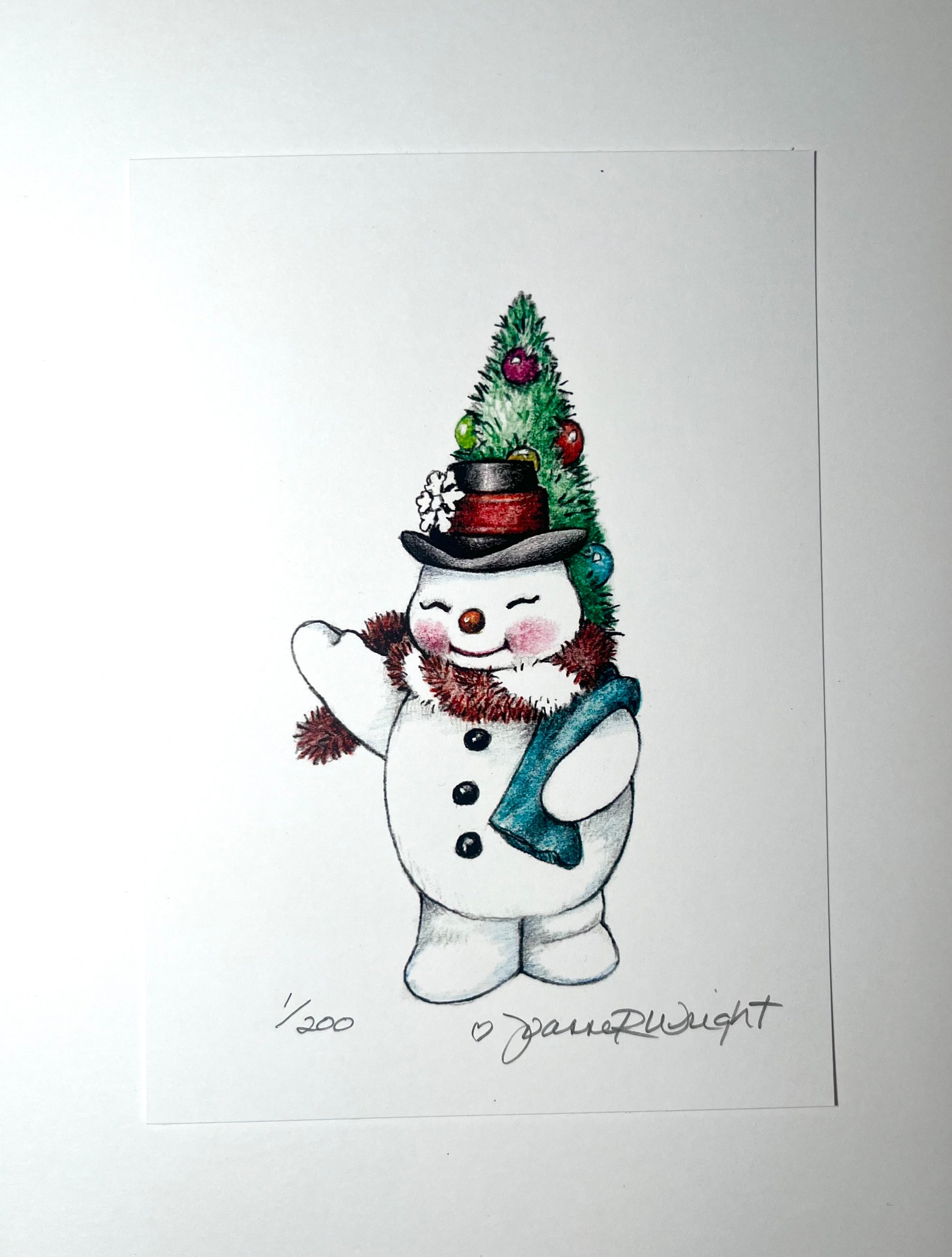 To complement the Retro Snowman Christmas Tree Ornament by Joanne Wright Studio, we printed the sketch that originally inspired the ornament. The artwork is a reproduction of the original sketch, printed on sturdy card stock paper. Each print is numbered and signed by the artist. Only 200 were printed.